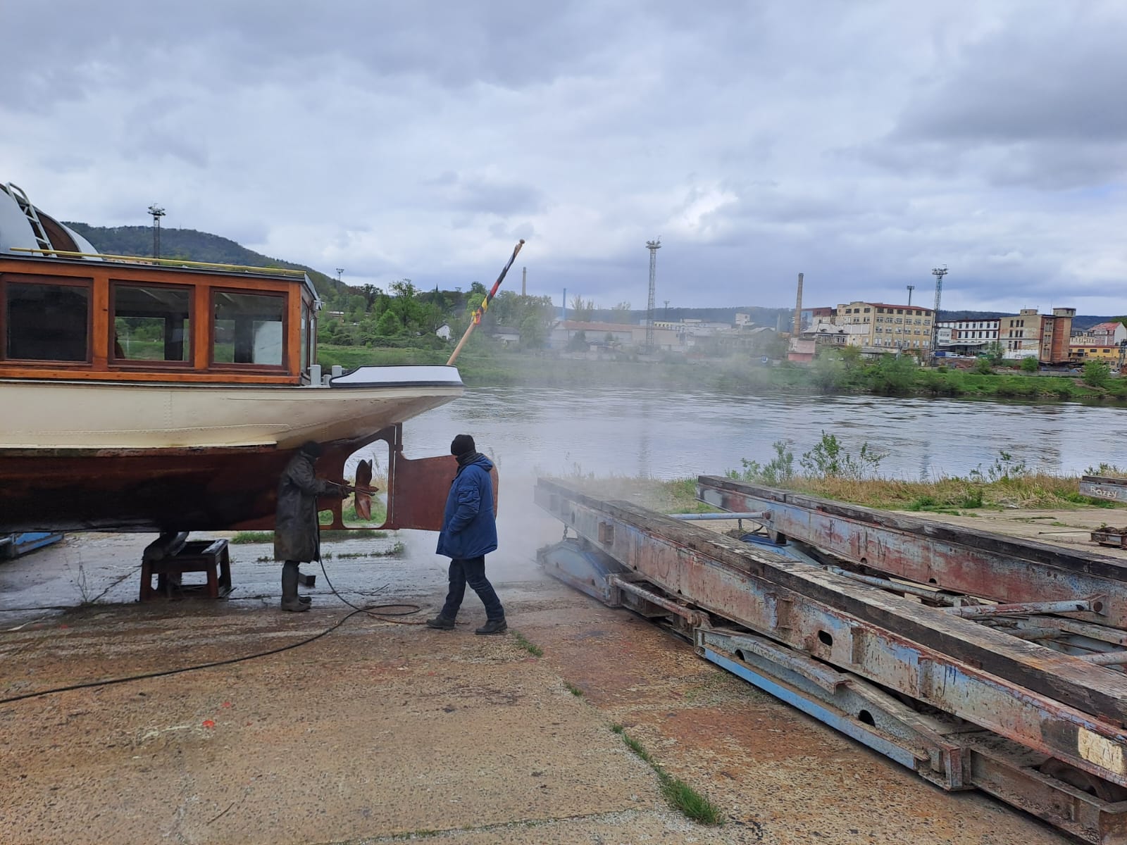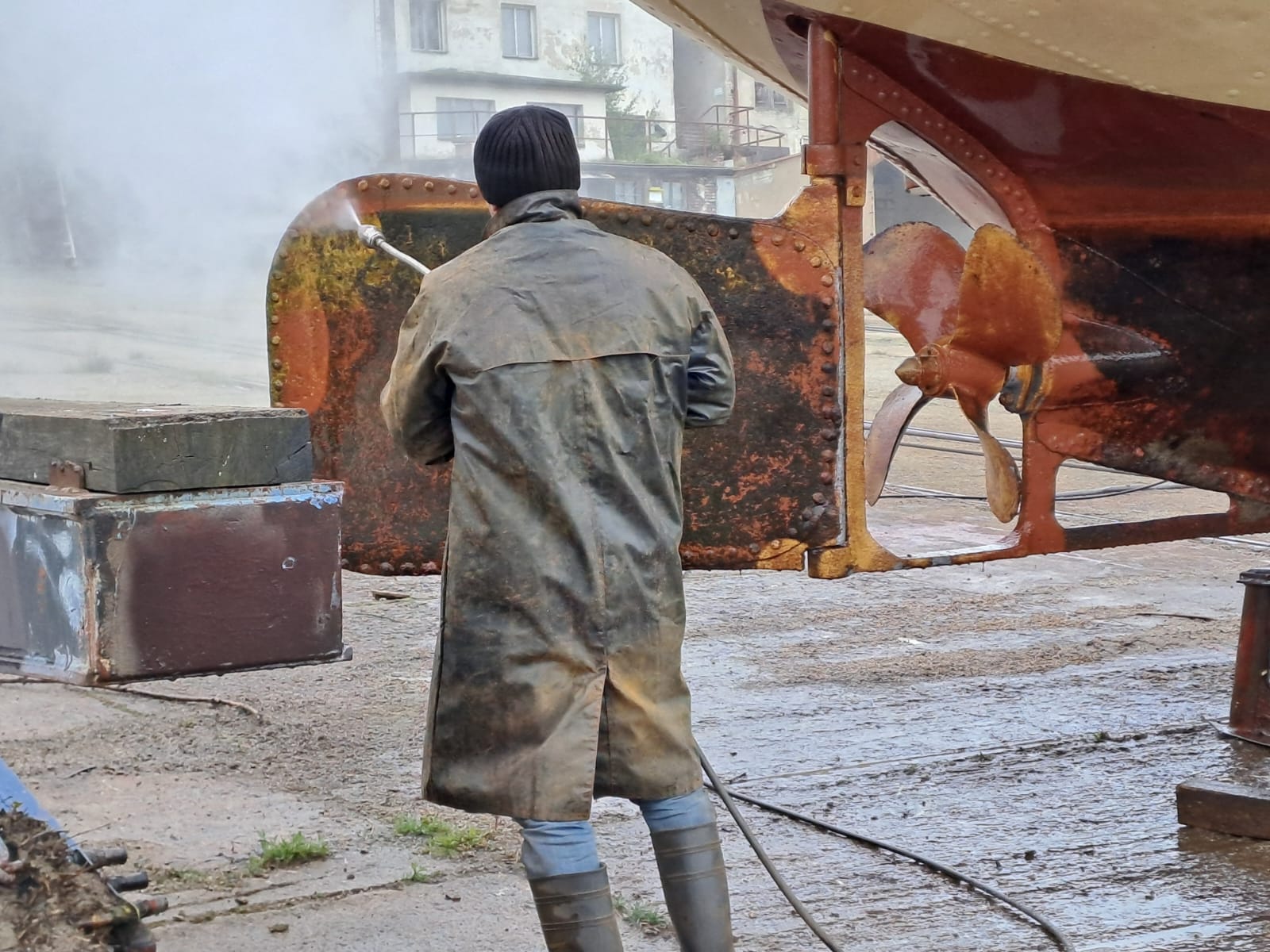 Zuerst musste der ganze Schmutz, der sich über die Jahre am Rumpf angesammelt hatte, entfernt werden. Diese Aufgabe wurde von den fleißigen und stets hilfsbereiten Mitarbeitern der Werft übernommen.